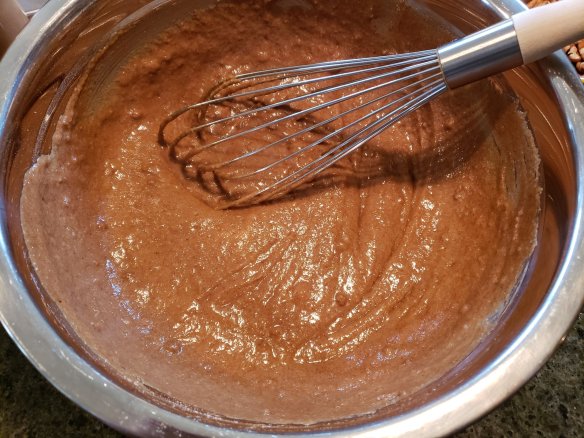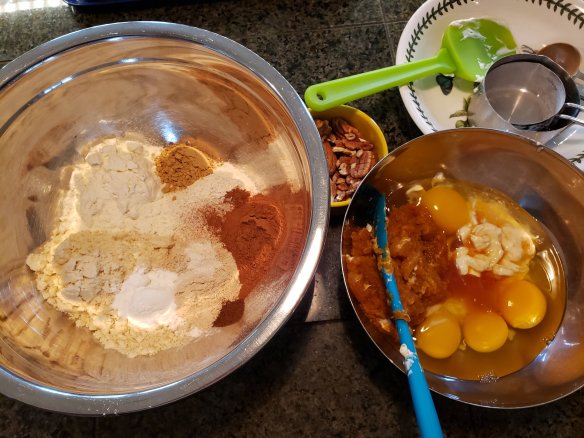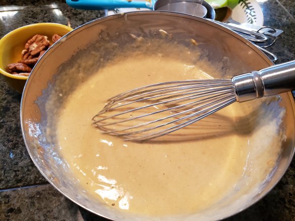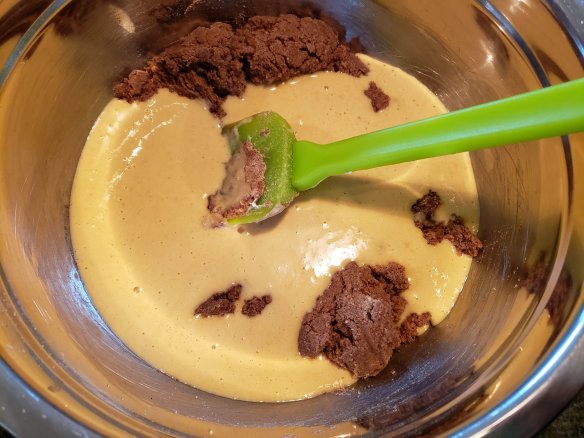 - Add egg/pumpkin/sour cream wet mix to dough and stir or beat lightly until a nice heavy cake batter. Make sure you whisk well to remove lumps.