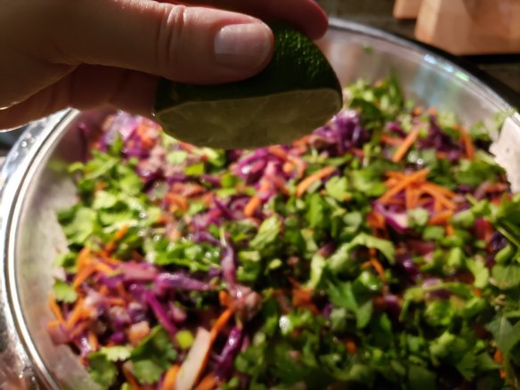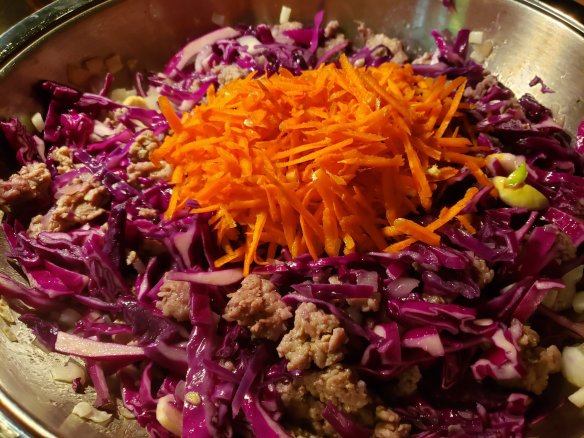 - Toss in the sliced cabbage, bell peppers and grated carrots.