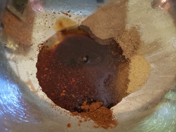 - In a separate bowl mix together the spices, soy sauce, sesame oil and keto honey, stir well.