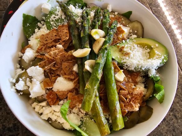 Top with any other veggies of your choice. I added hot buttered garlic asparagus.
