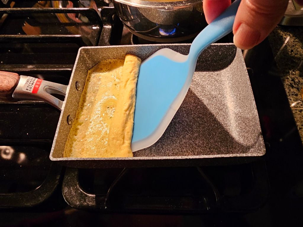 Heat the pan, grease it, and start your omelette, rolling up each layer from one side to the other with each pour.