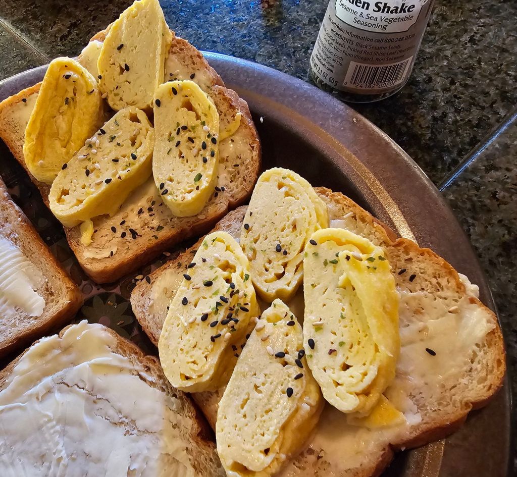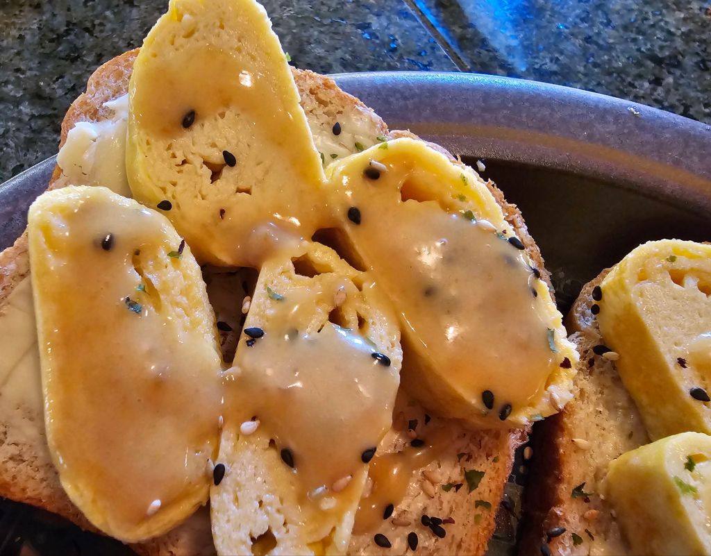 I made a sando but you could also serve over low carb rice, steamed veggies or low carb noodles, bonito flakes and soy sauce, top with black sesame seeds, chopped green onions, and flaked seaweed.