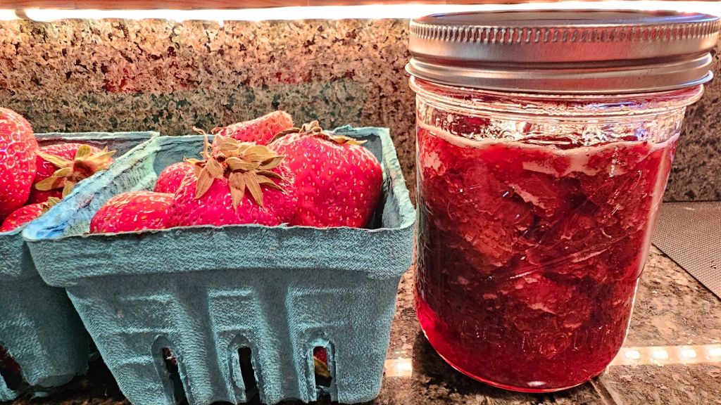 My Sister shared an interesting email today about vitamin D, calcium, collagen and there was also a recipe for Chimichurri. Which I love! Thanks, D! I didn’t have all the ingredients it called for but it inspired me to create this recipe above as my partner had just brought in a bunch of garlic scapes a few days ago. The garlic is now lifted and drying on the fence before he braids it. The photo above is the garlic and blackberries getting acquainted. Not to worry, the blackberries are contained in a very large pot.
