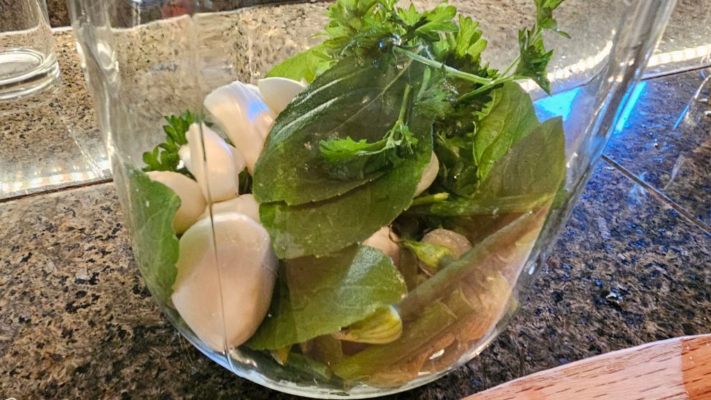 - Wash all herbs very well, dry off and chop to make blending easier, add to very large jar, big enough to fit a blender stick