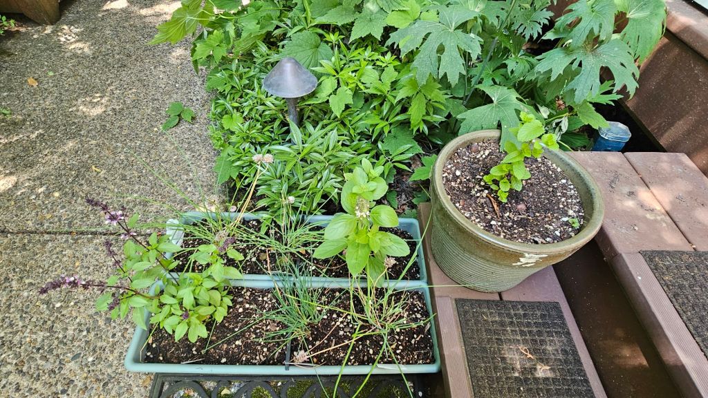 The cilantro root that was given to my partner from a fellow vegetable gardener. After using it for the recipe I thought to try and see if it will grow fresh cilantro for us. I’m also trying to root the mint. The other is fresh oregano and I kept the beautiful flowers.