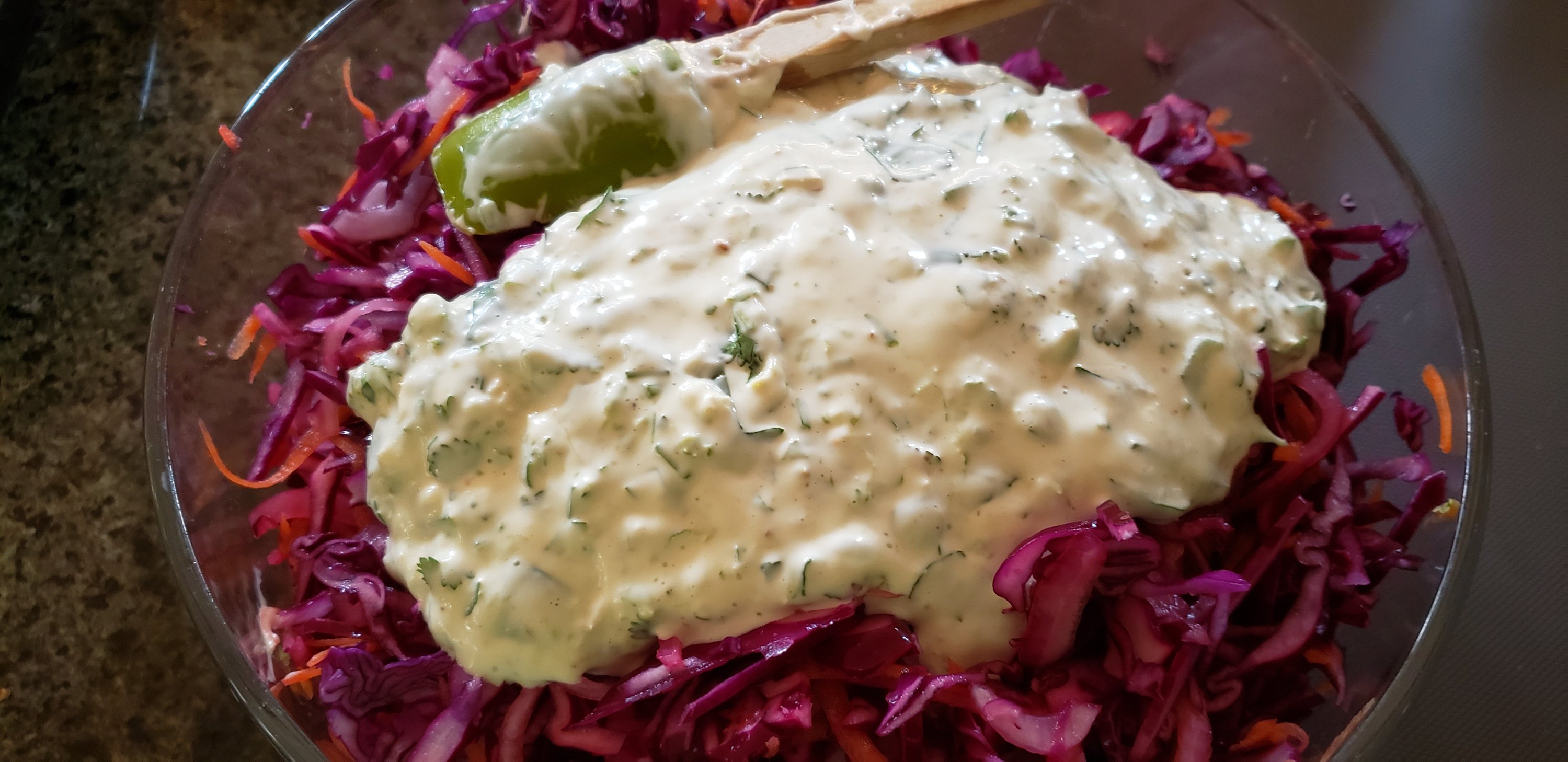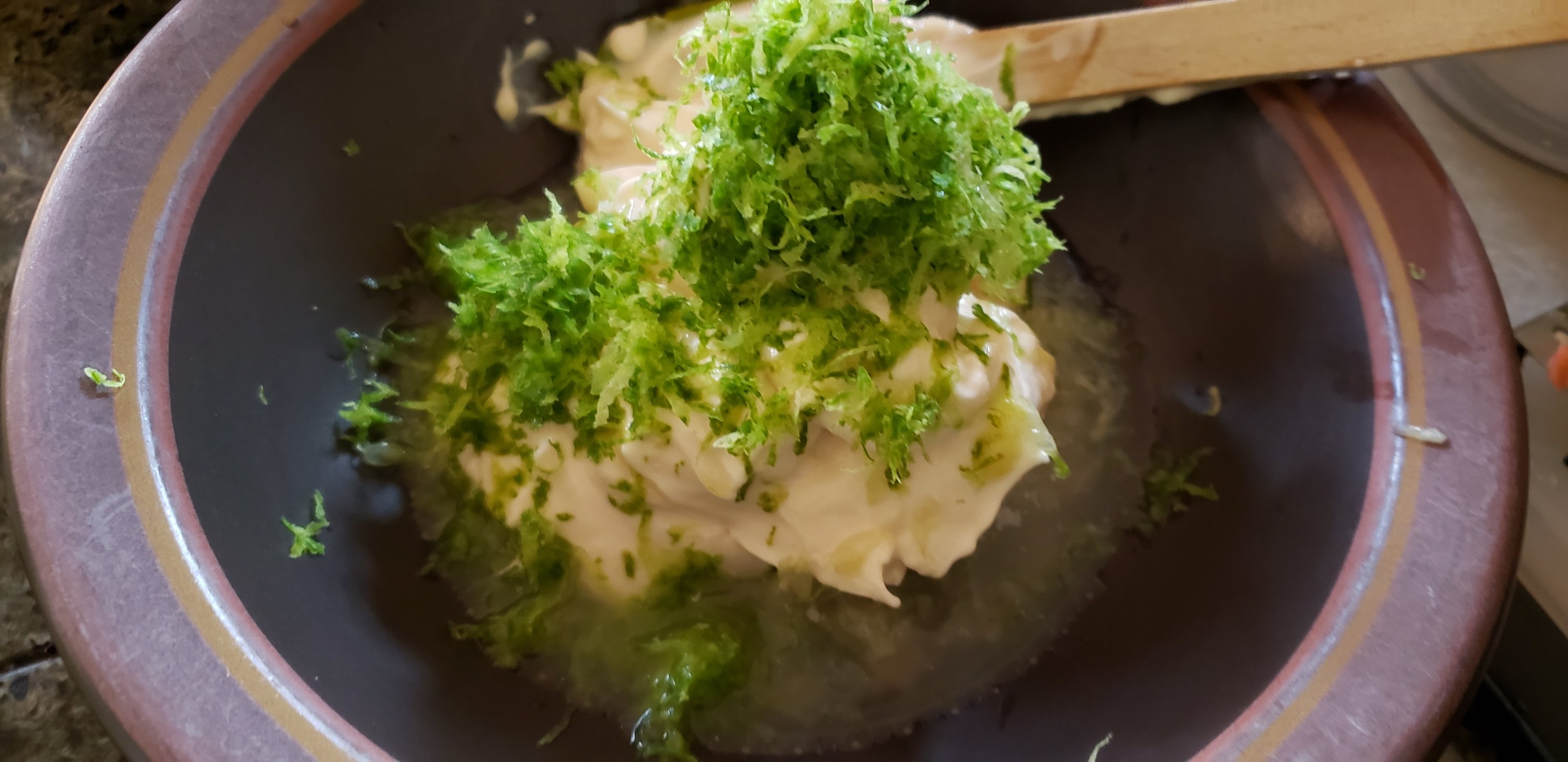 Mix mayo ingredients together. (Zest/juice of lime, crushed garlic and ginger, chili, spices and cilantro)
