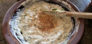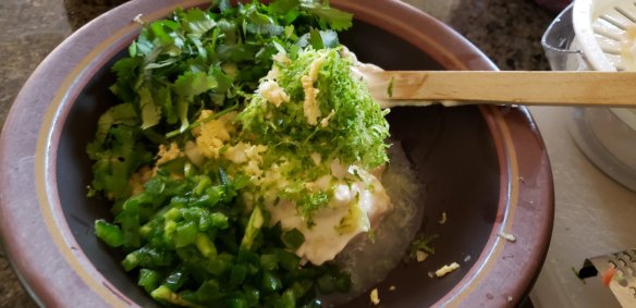Mix mayo ingredients together. (Zest/juice of lime, crushed garlic and ginger, chili, spices and cilantro)