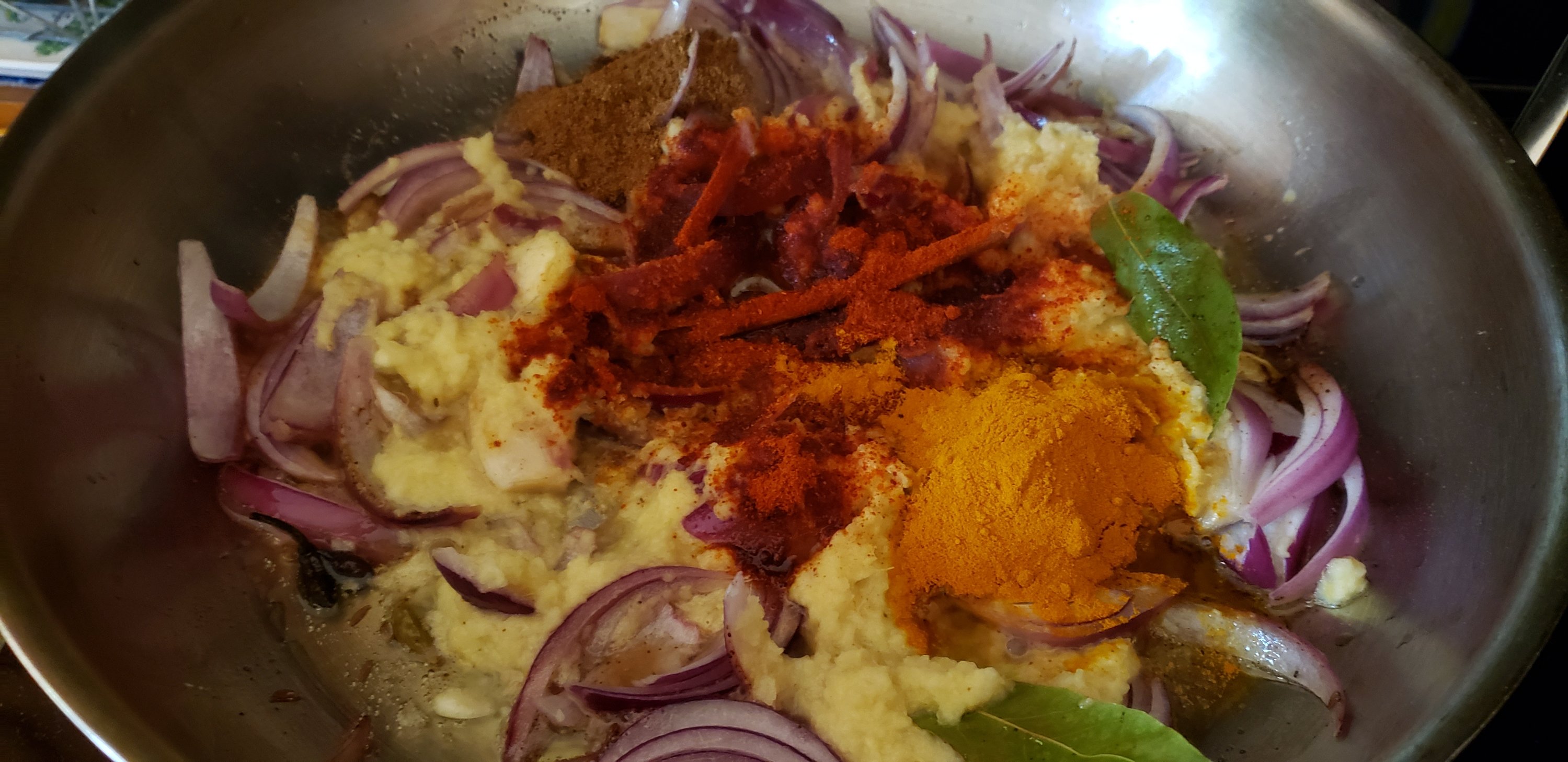Toasted spices, added onion, pureed ginger and garlic, curry powder, turmeric, chili powder, bay, lime and curry leaves. Add fresh diced tomatoes, simmer and add meat of choice. This turned into a chicken curry.