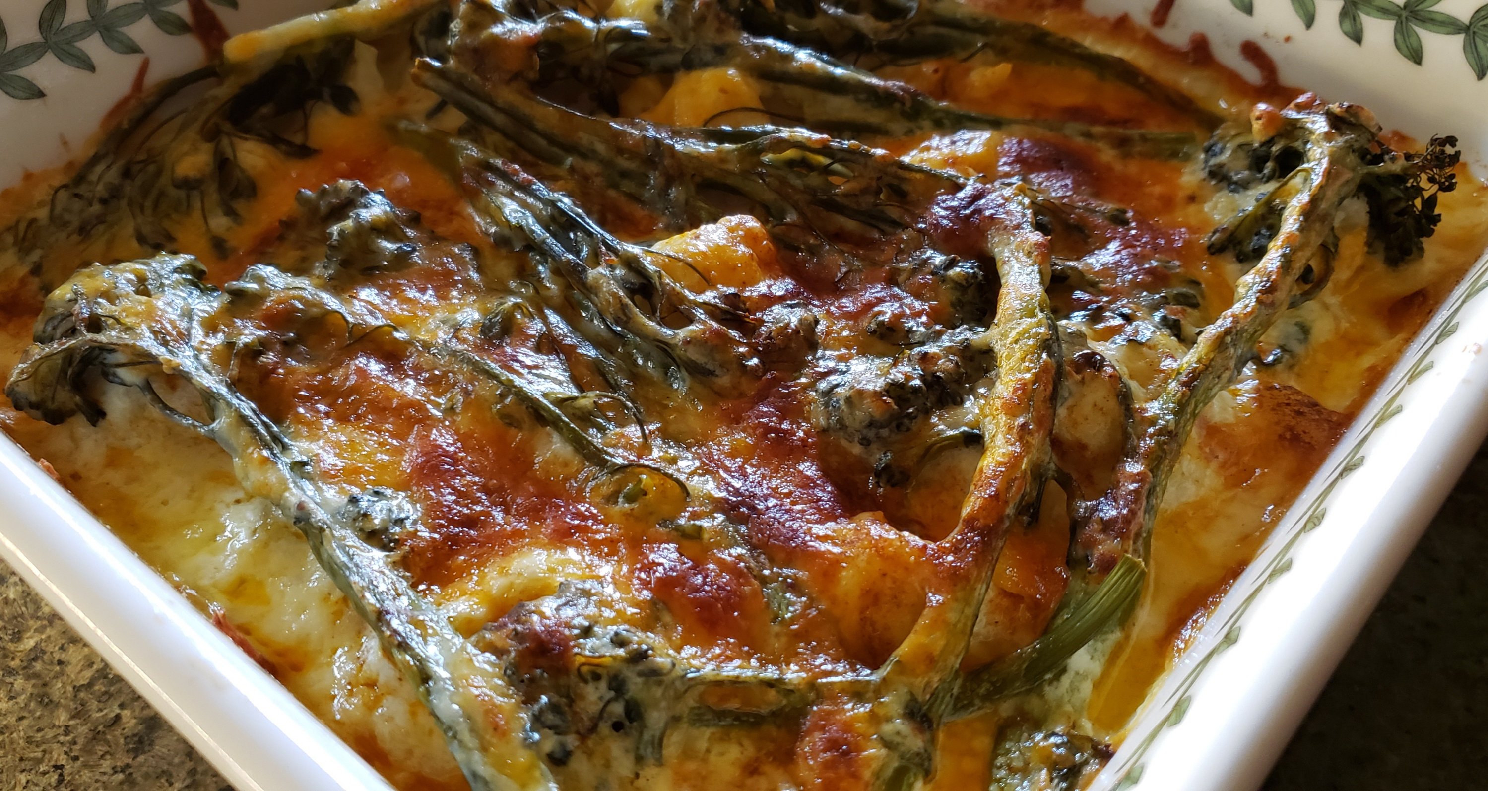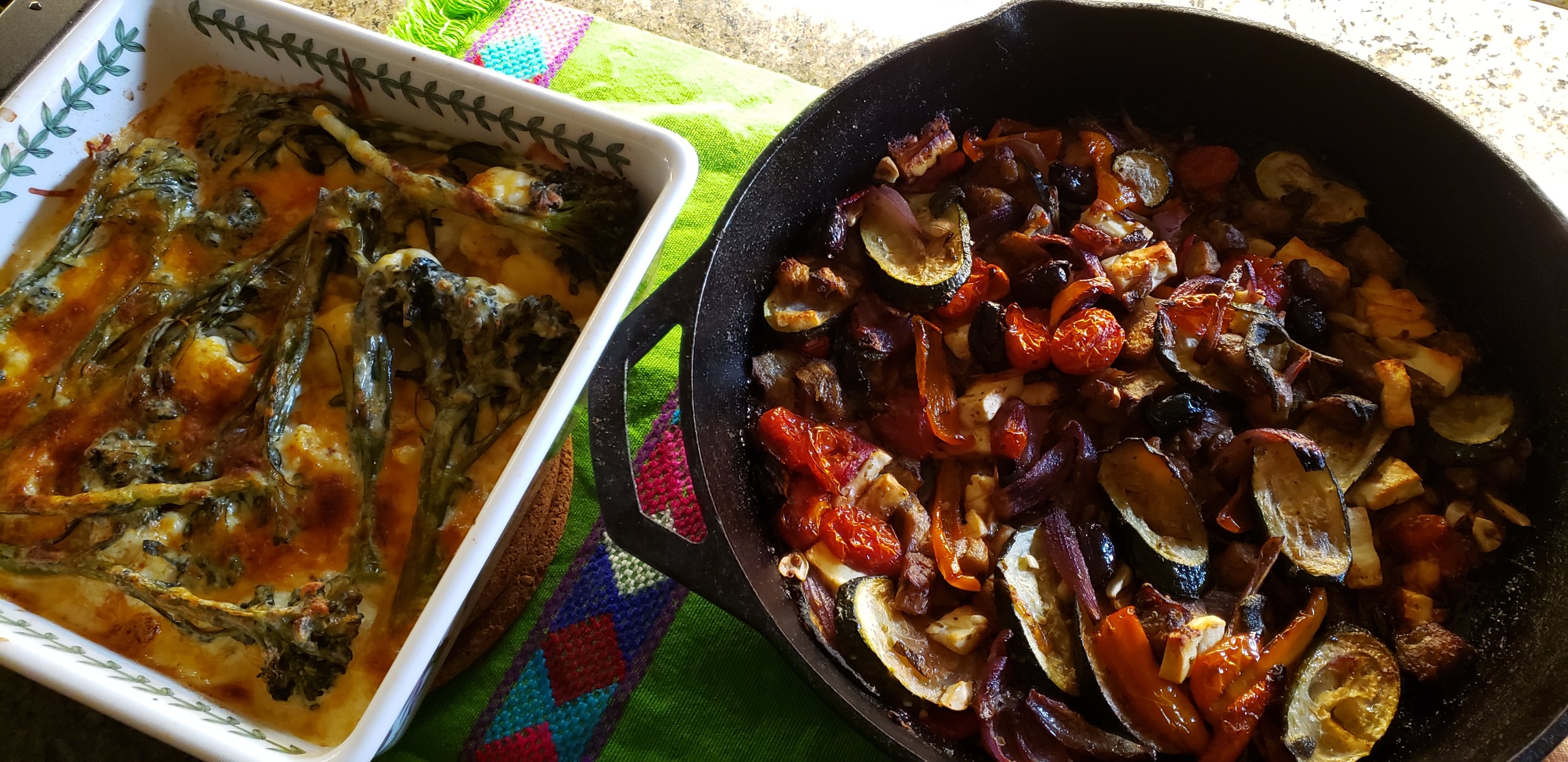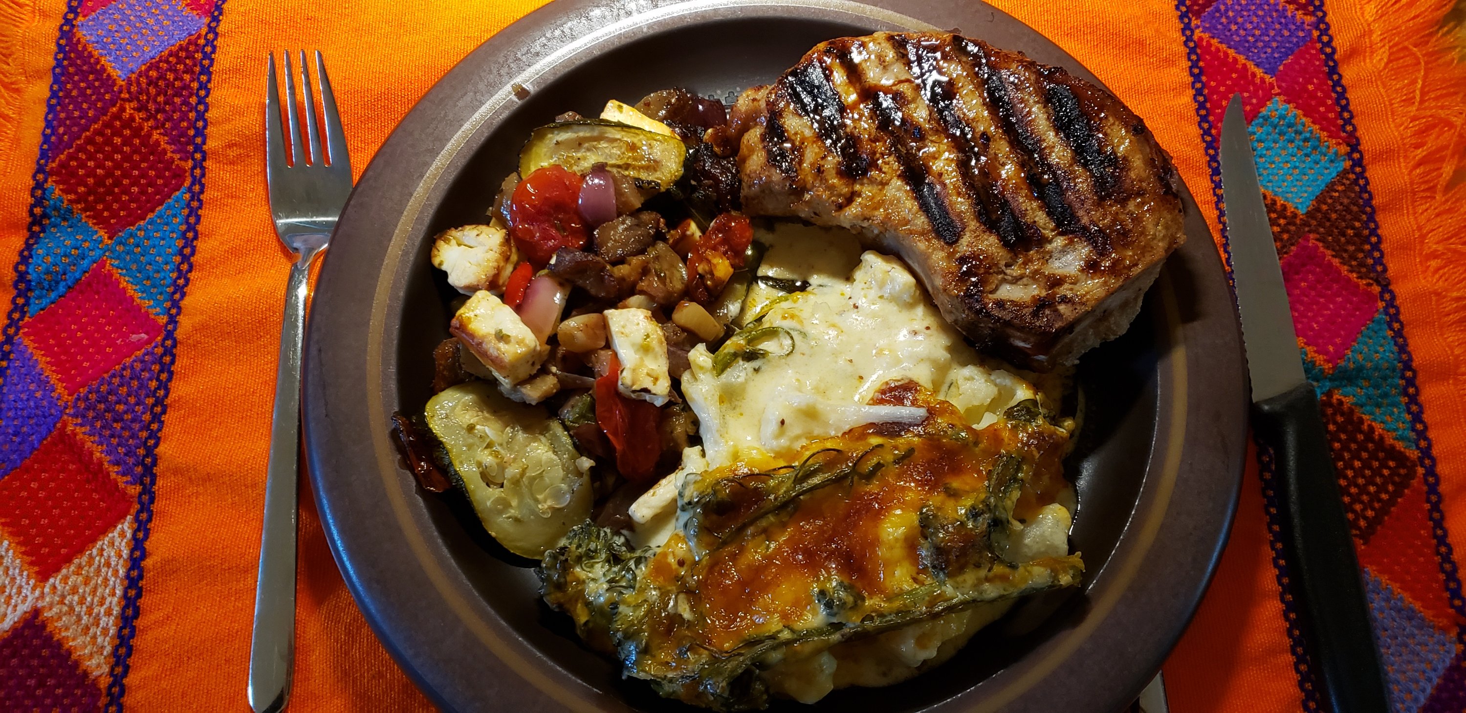 Cauliflower and broccoli cheese, Mediterranean veggie tray bake and pork chop.